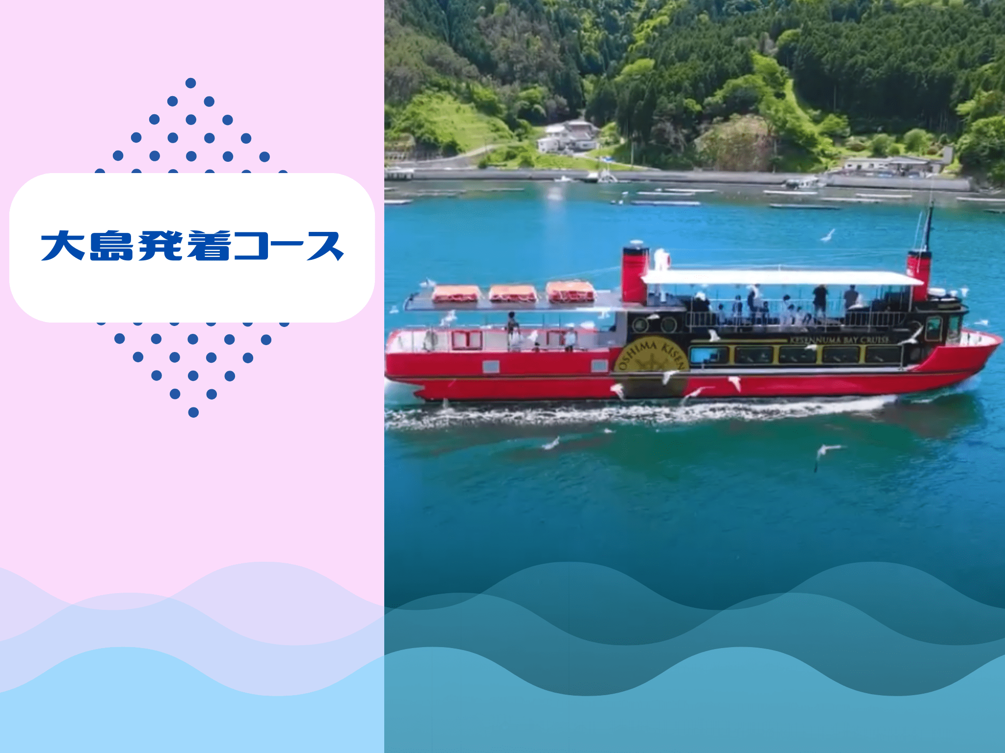 The Kesennuma Bay Cruise tours Kesennuma Bay and Kesennuma Oshima Island within the Sanriku Fukkō National Park. Our marine guides provide a memorable cruise experience, sharing insights into Kesennuma's nature, history, and seasonal highlights. Featuring the popular seagull feeding experience, this maritime sightseeing attraction appeals to all ages. Enjoy the unique seascape from the boat as you gaze upon the calm, blue waters of Kesennuma Bay. 🚢 Oshima Departure/Arrival Course (Duration: Approx. 50 min) A loop course departing from Oshima. This new route departs from Urahama Port on Kesennuma's “Oshima” island, known as the “Green Pearl.” Passing under the Kesennuma Oshima Bridge with views of Mount Kameyama, you'll sail refreshingly through the calm waters of the Oshima Strait. At the turning point of the route, the mystical cobalt blue of beautiful Mainebay offers a chance to enjoy the fantastical scenery of a quiet cove. This cruise lets you leisurely savor the seascape stretching from Oshima to the Karakuwa Peninsula, enveloped in the calm seas and refreshing breezes unique to Kesennuma Bay. You can also enjoy interactions with seagulls, making this a popular sea tour route easily accessible from Oshima. ◼️Main Highlights◼️ ✔️Oshima's coastline and natural scenery ✔️Quiet coves and rias coastline formations ✔️Sea view of the Kesennuma Oshima Bridge ✔️Unique rias coastline landscapes ✔️The calm waters of Oshima Seto dotted with oyster rafts ✔️The fantastical, cobalt-blue beauty of Maene Bay ✔️Interaction with seagulls This cruise offers maximum satisfaction, letting you experience the charm of Kesennuma's industry, nature, and port town all at once. 💰Fares Junior high school students and older: ¥1,800 Elementary school students: ¥900 Class 1 Disability Certificate (Junior high school students and older / Accompanying person): ¥900 Class 1 Disability Certificate (Elementary school students): ¥450 Children under elementary school age (1 child per accompanying adult): Free ※Children under elementary school age cannot board alone. ※Presenting any of the following certificates entitles the holder and one accompanying caregiver to the above rates: - Disability Certificate (Class 1) - Rehabilitation Certificate (Grade A) - Mental Disability Welfare Certificate (Grade 1) ※Please present the certificate at the ticket counter on the day of the cruise. ※If the certificate is forgotten, the difference between the discounted and standard rates will be charged. ⏰ Departure Times ① 10:00 AM ② 11:00 AM ③ 12:00 PM ④ 1:30 PM ⑤ 2:30 PM ⑥ 3:30 PM (Additional departures during Golden Week, Obon, and Silver Week) 【Operating Period】 Saturdays, Sundays, and holidays from April 25, 2026 to October 25, 2026 (including Golden Week, Obon, and Silver Week) ※Subject to change. 【Inquiries from Oshima】 080-1856-2145