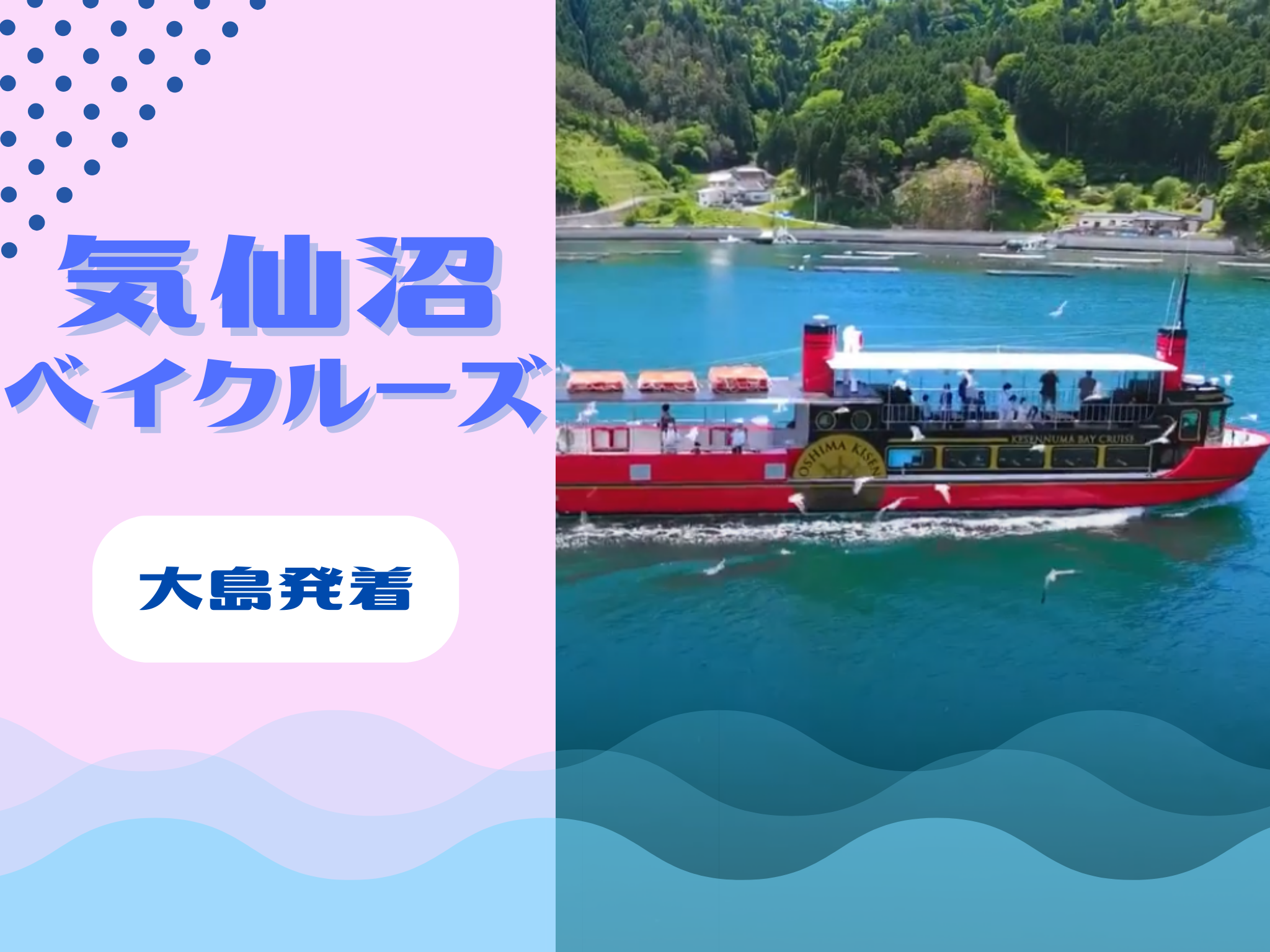 陸中海岸国立公園に位置する気仙沼湾と気仙沼大島をめぐる「気仙沼ベイクルーズ」。 海の案内人であるマリンガイドが、気仙沼の自然や歴史を交えながら、心に残るクルーズの時間をご案内します。 ウミネコの餌付け体験も楽しめるため、幅広い年代に人気の海上観光です。 青く穏やかな気仙沼湾を船から眺めながら、海上ならではの景色をお楽しみください。 🚢大島発着コース(所要時間:約50分) 大島から出航する周遊コース。 「緑の真珠」と呼ばれる気仙沼大島・浦の浜から出航し、亀山を望みながら気仙沼大島大橋をくぐり抜け、波の穏やかな大島瀬戸を爽快に進む新コースです。 航路の折り返し地点となるコバルトブルーが美しい舞根湾では、海上ならではの静かな入り江の風景を楽しむことができます。 気仙沼湾特有の穏やかな海と爽やかな風に包まれながら、大島〜唐桑へと広がる海景色をゆったりと堪能できるクルーズです。ウミネコとのふれあいも楽しめ、島から気軽に参加できる海上観光として人気の航路です。 ◼️主な見どころ◼️ ✔️大島の海岸線と自然景観 ✔️静かな入り江やリアス海岸の地形 ✔️気仙沼大島大橋を海上から望む ✔️牡蠣いかだが広がる湾内の風景 ✔️ウミネコとのふれあい 💰料金 中学生以上 1800円 小学生 900円 身体障害者一種(中学生以上/付き添い) 900円 身体障害者一種(小学生) 450円 小学生未満(大人同行1名につき1名)無料 小学生未満(大人同行1名につき2名以降)900円 ※小学生未満のみの乗船は不可。 ※身体障害者手帳(第1種), 療育手帳(判定A), 精神障害者福祉手帳(1級)の各手帳のいずれかを提示いただくとご本人とその介護者(1名)が上記料金となります。 ※各手帳のいずれかを当日チケットカウンターで掲示願います。当日手帳を忘れた場合は通常料金との差額を頂戴いたします。 ⏰出航時間 ①10:00発 ②11:00発 ③12:00発 ④13:30発 ⑤14:30発 ⑥15:30発(GW・お盆・シルバーウィーク 増便) 【開催期間】 2026/4/25~2026/10/25の土日祝日(GW・お盆・シルバーウィーク含む) ※変更になる場合がございます。 【大島発お問合せ】 080-1856-2145