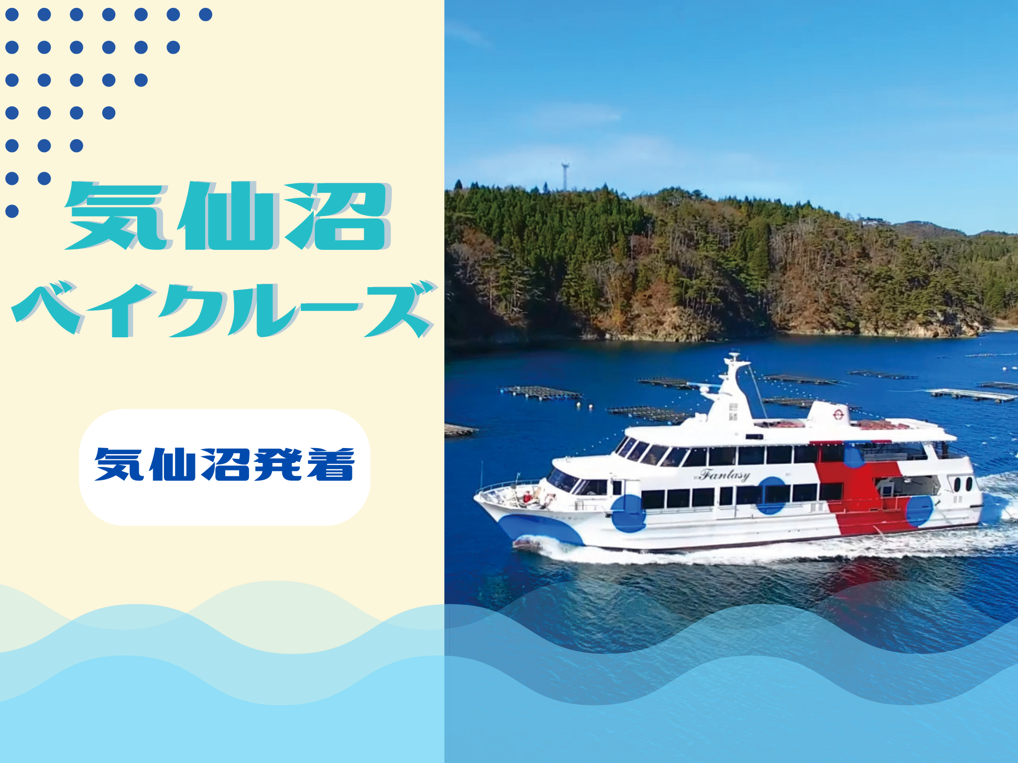 陸中海岸国立公園に位置する気仙沼湾と気仙沼大島をめぐる「気仙沼ベイクルーズ」。 海の案内人であるマリンガイドが、気仙沼の自然や歴史を交えながら、心に残るクルーズの時間をご案内します。 ウミネコの餌付け体験も楽しめるため、幅広い年代に人気の海上観光です。 青く穏やかな気仙沼湾を船から眺めながら、海上ならではの景色をお楽しみください。 🚢気仙沼発着コース(所要時間:約50分) 気仙沼観光の定番となる、港から出航する周遊コース。 気仙沼内湾を出て、漁船群が係留される港の風景を横目に進み、気仙沼湾横断橋をくぐり抜けます。航路の途中では、日本で3カ所しかないシップリフト方式を採用した造船設備を持つ「みらい造船」を海側から見学できるのも、このクルーズならではのポイント。さらに、気仙沼大島大橋をくぐり、リアス海岸の入り組んだ地形や牡蠣いかだの広がる湾内を爽快に周遊します。 ◼️主な見どころ◼️ ✔️気仙沼湾横断橋 ✔️日本でも珍しいシップリフト方式の「みらい造船」 ✔️気仙沼大島大橋の海上ビュー ✔️リアス海岸ならではの景観 ✔️牡蠣いかだが広がる湾内の風景 ✔️ウミネコの餌付け体験 気仙沼の産業・自然・港町の魅力が一度に楽しめる、満足度の高いクルーズです。 💰料金 中学生以上 1800円 小学生 900円 身体障害者一種(中学生以上/付き添い) 900円 身体障害者一種(小学生) 450円 小学生未満(大人同行1名につき1名)無料 小学生未満(大人同行1名につき2名以降)900円 ※小学生未満のみの乗船は不可。 ※身体障害者手帳(第1種), 療育手帳(判定A), 精神障害者福祉手帳(1級)の各手帳のいずれかを提示いただくとご本人とその介護者(1名)が上記料金となります。 ※各手帳のいずれかを当日チケットカウンターで掲示願います。当日手帳を忘れた場合は通常料金との差額を頂戴いたします。 ⏰出航時間 ①10:00発 ②11:00発 ③12:00発 ④13:30発 ⑤14:30発 ⑥15:30発(GW・お盆・シルバーウィーク 増便) 【開催期間】 2026/4/25~2026/11/29の土日祝日(GW・お盆・シルバーウィーク含む) ※変更になる場合がございます。 【気仙沼発お問合せ】 (0226)23-3315